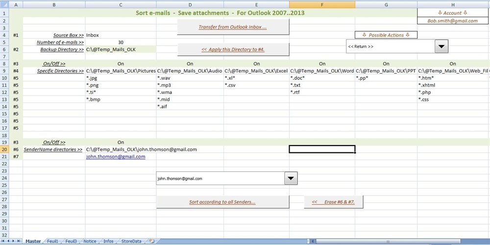 1. The application allows you to store all your attachments in a folder on the hard disk or a USB stick , for example. You can even set up sub- folders where you can store files such as Image , Excel , Word , PDF , PowerPoint, etc. All types are configurable and allow you to store your documents as you wish. . It is possible to store all the e-mails you receive in the same place, or you may choose to create a separate folder for each individual sender, or a common folder for e-mails received from several senders (e.g. a company or service, or an individual using multiple identities.) The application has been tested for mailboxes containing more than 5000 e-mails; the average processing time is 500 messages per minute . 2) The e-mails are sorted in chronological order (date, sender, subject, body of message); you can then copy and paste their content into a Word document, for example. A very useful function of this application is to create a thread , using the following trick : temporarily, you can temporarily mix sent e-mails and received e-mails , you in Outlook, then with this application, you get a chronological "thread" of your discussions with your correspondents . Below is the main screen, where we see the Backup Folder "C: @ Temp_Mails_OLK "; 1 sender has been selected to have his attachments stored in a personal subfolder. For example, all Excel workbooks from the Accounting department will be placed in the "C: \@ Temp_Mails_OLK\john.thomson@gmail.com\Excel" folder ... : |