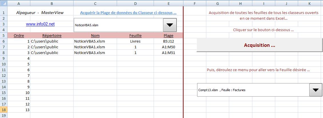 1) L'application vous permet de copier et de voir le contenu d'une plage quelconque, située dans toute feuille de tout classeur accessible depuis votre ordinateur... Vous pouvez créer une liste de classeurs consultés habituellement. 2) L'application permet une deuxième possibilité : copier dans UNE feuille de ce classeur le contenu de TOUTES les feuilles de tous les classeurs ouverts dans Excel - dans la limite du million de lignes environ disponibles ... : |